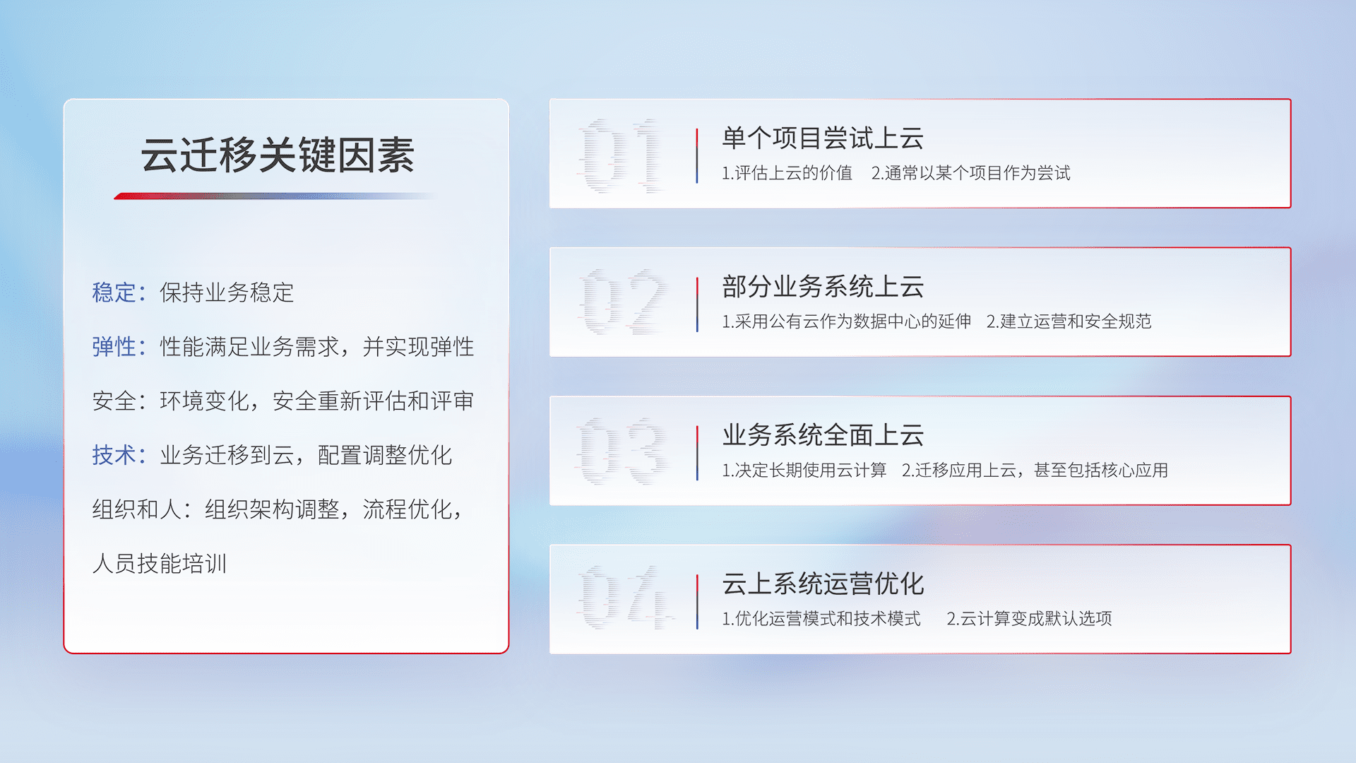 结合实际业务,,,,从规划设计、、云平台选型、、、、云原生改造、、、数据迁移、、、集成交付,,,迁移全过程为客户识别最佳上云路径,,,做好风险识别管理,,,设计网络架构、、身份权限、、安全审计合规、、操作审计、、、、日志审计、、、监控告警策略、、多站点容灾设计等,,,,对云上基础设施进行整体规划,,提升IT治理水平,,,,以满足弹性、、、、高可用、、、、高性能的需求。。。。