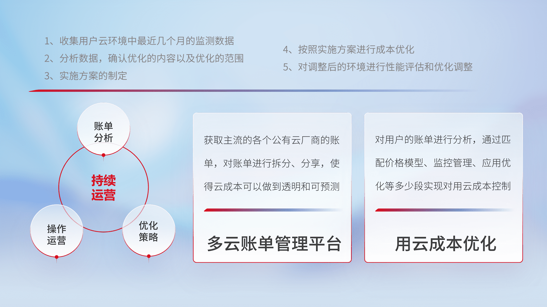 通过多云纳管,,,,以统一的资源数据模型把客户的云资源进行抽象和封装,,,进而实现对多云资源的统一操作,,,保障云资源管理的可靠性、、稳定性与可用性。。量身定制化运维内容,,,,配置、、、开发运维、、补丁管理、、、、备份、、、、监控、、、认证和访问管理、、审计和日常巡检等,,保障在用云过程中的可靠度,,,,稳定度以及高可用率。。